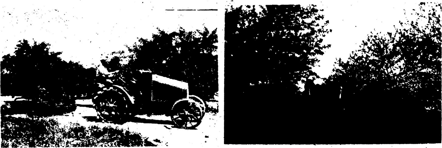Another picture shows the younger Berger using one of Jacksonport's first tractors to work the family orchard. It was an International 8-16. My reference, Farm Tractors In Color (Macmillan, 1974) dates this as a 1919 model.