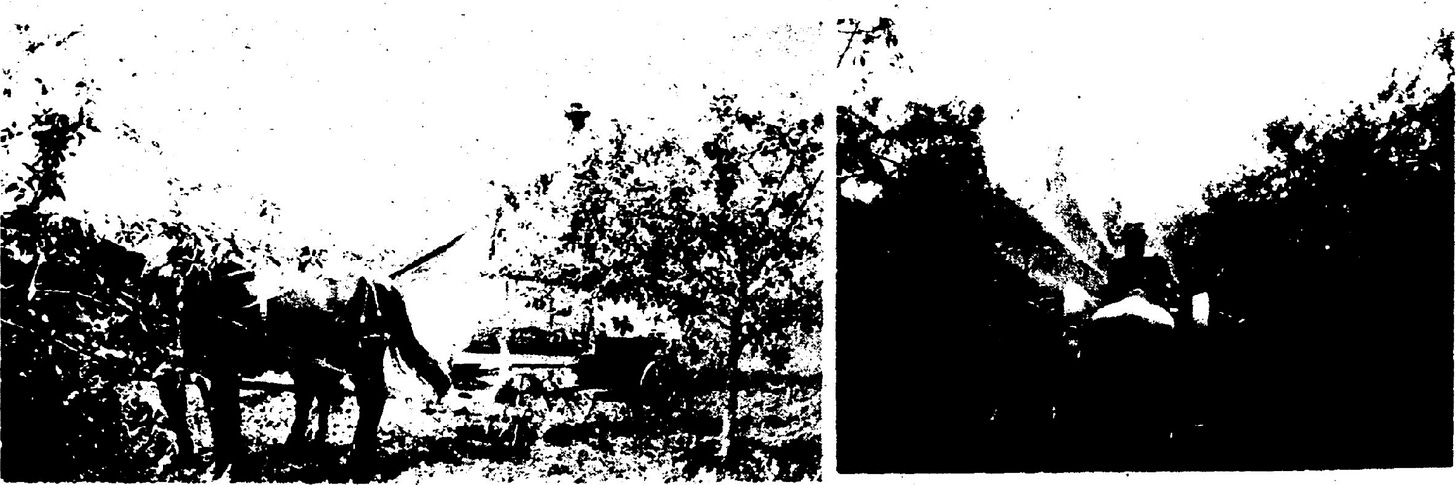 A team drawn sprayer was used to spray cherry trees in the early life of the Fred Berger orchard at Jacksonport but now Joseph Kuehn uses a tractor drawn rig to spray Mrs. Gerald Carmody's orchard.
